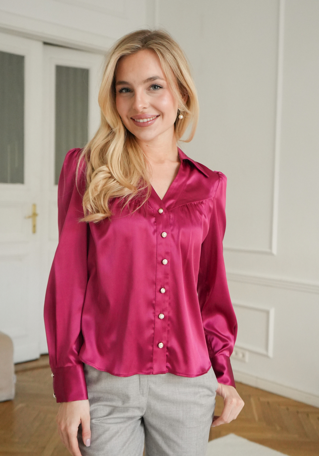 Subtelny, naturalny blask jedwabiu dodaje całości szlachetnego charakteru. Koszula ma klasyczny, lekko luźny fason, dzięki czemu pasuje pasuje zarówno do eleganckich spodni, jak i ulubionej spódnicy, szortów czy jeansów. Ozdobne perłowe guziki są pięknym detalem, który przyciąga spojrzenia i dodaje nuty luksusu. Całość dopełnia starannie skrojony kołnierzyk, nadający koszuli szyku i klasy. Długie rękawy zakończone mankietami oraz delikatne marszczenia przy ramionach podkreślają jej kobiecy charakter.